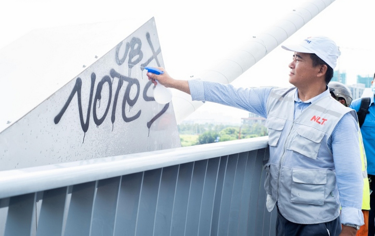 Ngày 3/8, Sở GTVT TP.HCM kết hợp cùng đơn vị thi công triển khai thử nghiệm chất tẩy rửa vết sơn, vẽ bậy trên cầu Thủ Thiêm 2.