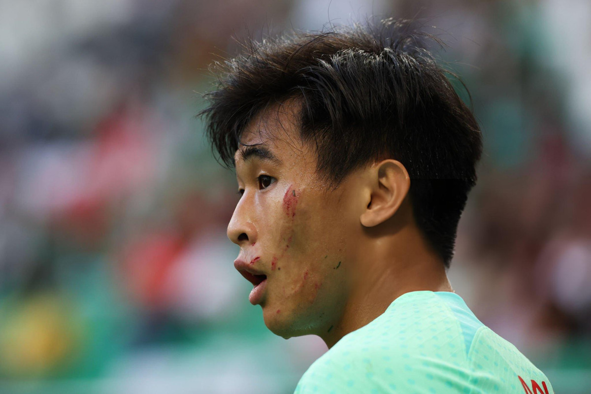 Cận cảnh cầu thủ Trung Quốc bị đạp rách mặt.