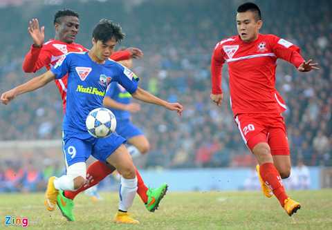 | Ngọc Thịnh (phải) thi đấu chững chạc trong màu áo CLB Hải Phòng ở mùa giải 2015. |