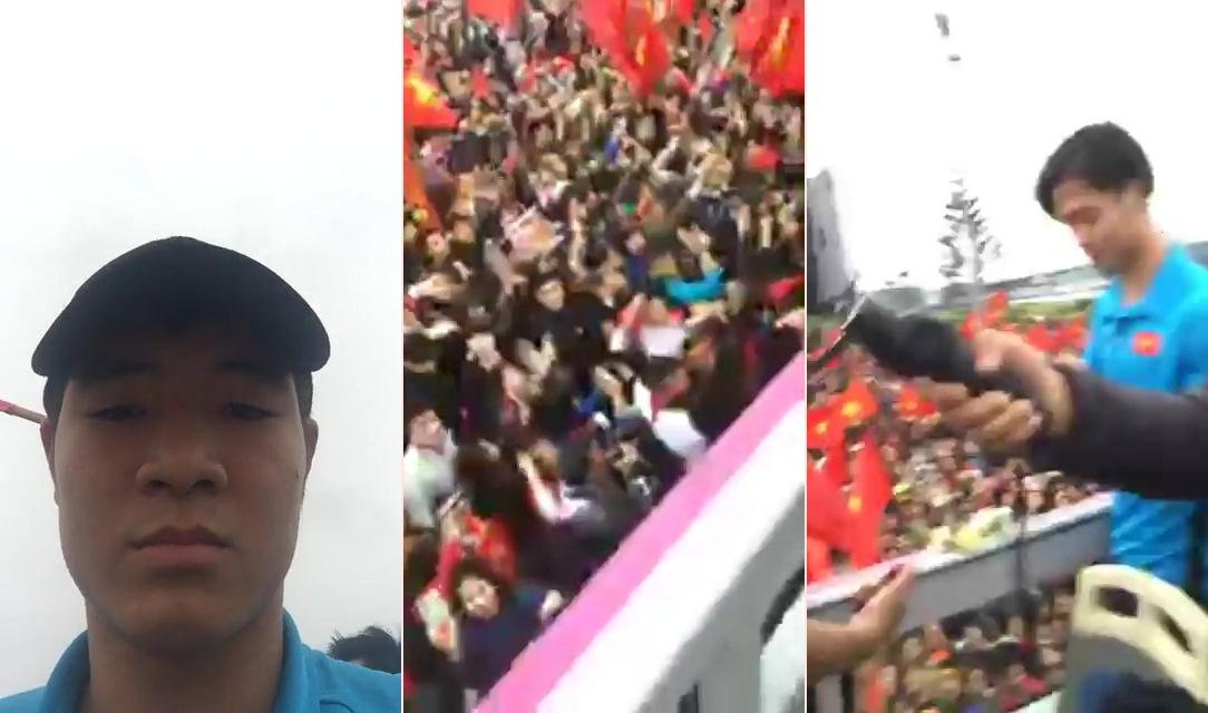 Cầu thủ Hà Đức Chinh đứng trên xe buýt 2 tầng, livestream trên Facebook cá nhân cảnh người hâm mộ cuồng nhiệt chào đón U23 Việt Nam trở về kèm lời bày tỏ "Yêu các bạn" gửi đến các CĐV.