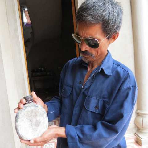 | Ông Mẫn Bá Tiện (em trai liệt sỹ Mẫn Bá Phùng) bên chiếc bi-đông được cho là của liệt sỹ Phùng |