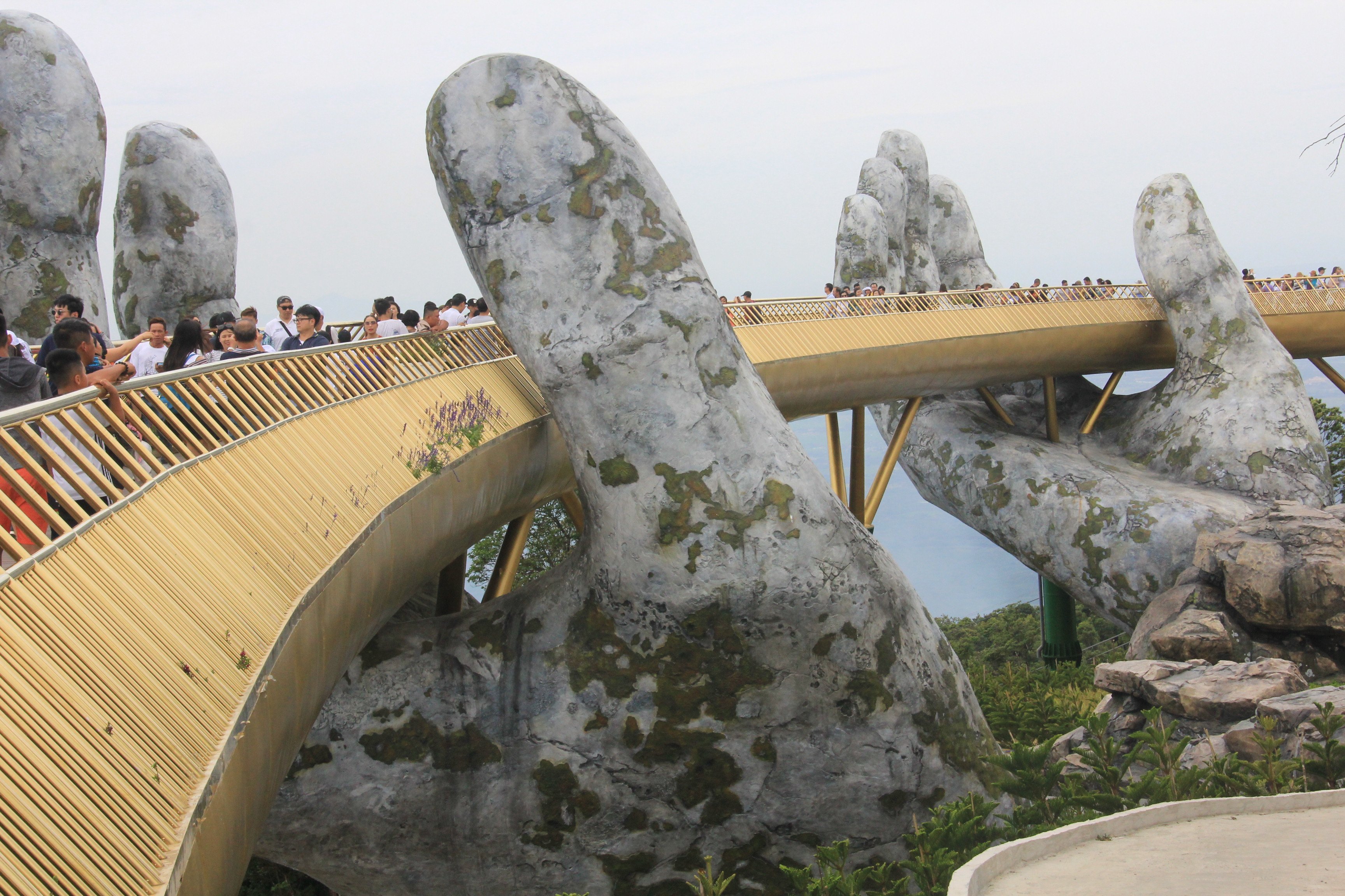 “Hai bàn tay bằng đá khổng lồ vươn ra từ dãy núi ở miền trung Việt Nam trông có vẻ già nua và giống như một tàn tích từ thời cổ đại. Nhưng đừng bị đánh lừa. Đó là mạng lưới dây kim loại và sợi thủy tinh được dùng để hỗ trợ cho một cây cầu đi bộ đáng kinh ngạc vừa mới được khánh thành vào tháng 6.