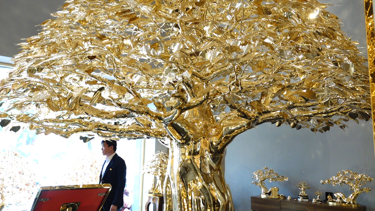 Dịp Tết Giáp Thìn, ông Đỗ Xuân Ngọc (Bình Thạnh, TP.HCM) ra mắt cây bồ đề mạ vàng cao 3,6m, nặng gần 1,2 tấn được chạm khắc tinh xảo, có giá lên tới 1 triệu USD.