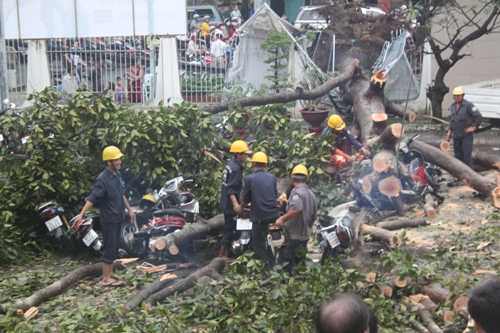 Xem clip: Cây bật gốc đè cả trăm xe máy tại nhà hát Hòa Bình