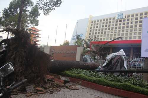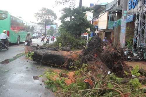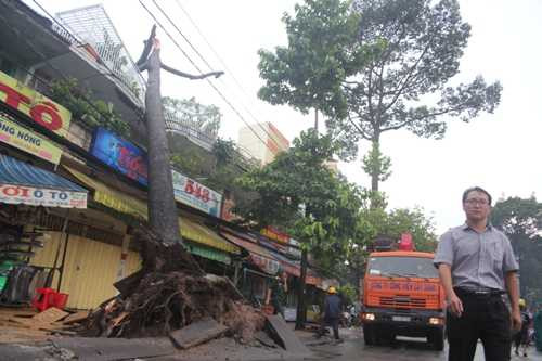 Tương tự trên đường Trần Phú đoạn qua số nhà 316 (P.8, Q.5), đường Trần Hưng Đạo đoạn qua số nhà 884 (P.7, Q.5) cũng có hai cây cổ thụ có đường kính hơn 50 cm ngã xuống đường, may mắn thời điểm này người đi đường né tránh kịp nên không có thương vong về người.