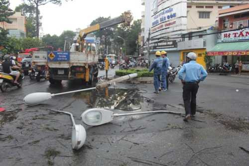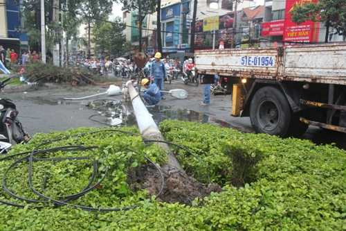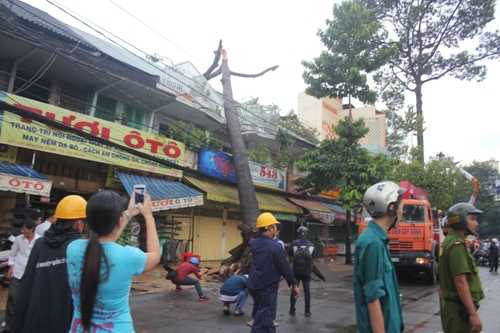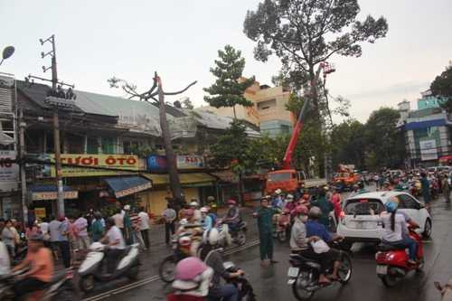 Các nhân viên cây xanh, điện lực TPHCM nhanh chóng có mặt để cắt bỏ nhằm tránh gây nguy hiểm cho người dân.