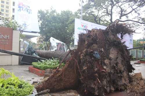 Tại hiện trường, thân cây có đường kính gần 1m, dài hơn 20m tán rất rộng đè lên bãi xe trong khuôn viên Nhà hát. Hàng chục xe máy bị bể nát, biến dạng trong đó có nhiều xe tay ga đắt tiền. Một mảng tường rào lớn bị thân cây cổ thụ đè sập. Phần gốc cây có đường kính khoảng 2m và chỉ có rễ cám.