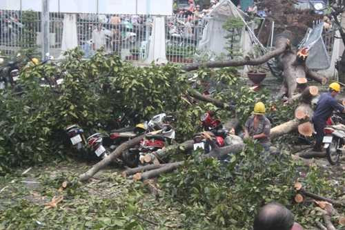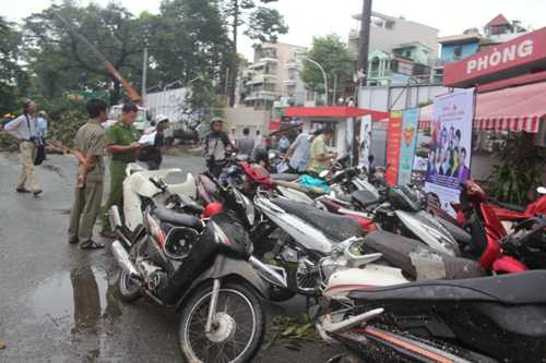 Tại đường Ba Tháng Hai (đoạn trước Nhà hát Hòa Bình, quận 10) một cây xanh bị bật gốc đè lên hàng chục xe máy trong khuôn viên Nhà hát Hòa Bình khiến nhiều người một phen kinh hoàng.
