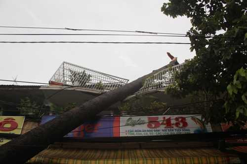 Tại góc giao lộ Trần Phú - An Dương Vương (P.8, Q.5), một cây xanh có đường kính 70cm, cao hơn 40 m đổ đè vào căn nhà số 543 nơi kinh doanh quán ăn gia đình. May mắn, phần thân cây chỉ làm sập lan can tầng 2 của ngôi nhà này.