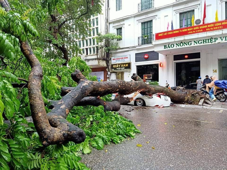 Vào khoảng 4h30 ngày 1/9, một cây sấu lớn bất ngờ đổ, đè bẹp chiếc taxi đang đỗ trước cửa nhà 14 Ngô Quyền (Hà Nội).