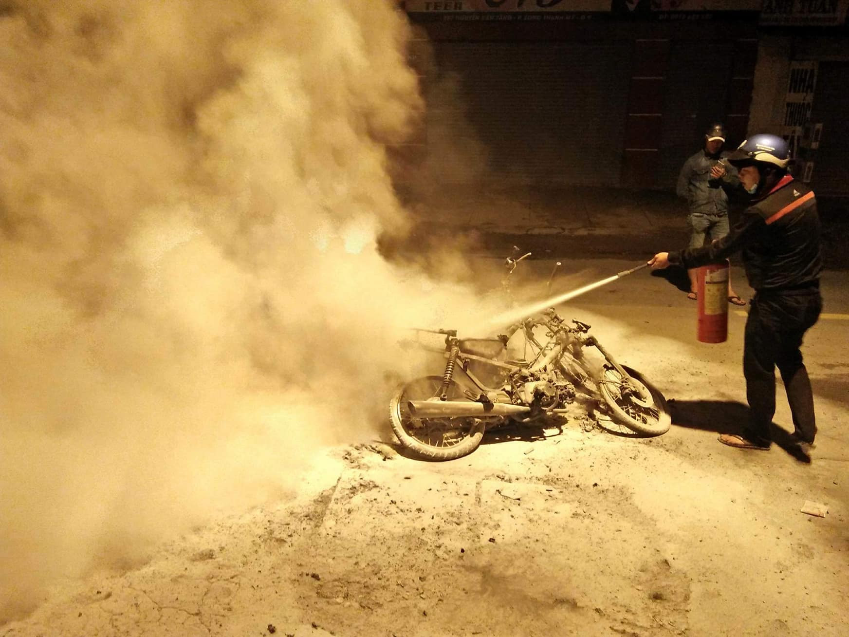 Tuy nhiên, khi ra đến giữa đường, 2 trong số 4 thanh niên nói trên dừng xe, bật lửa phóng hỏa đốt 2 chiếc xe máy của mình rồi bỏ đi nhưng bị người dân chặn lại và báo công an phường. Dù người dân đã cố gắng dập lửa nhưng 2 chiếc xe vẫn bị cháy trơ khung.