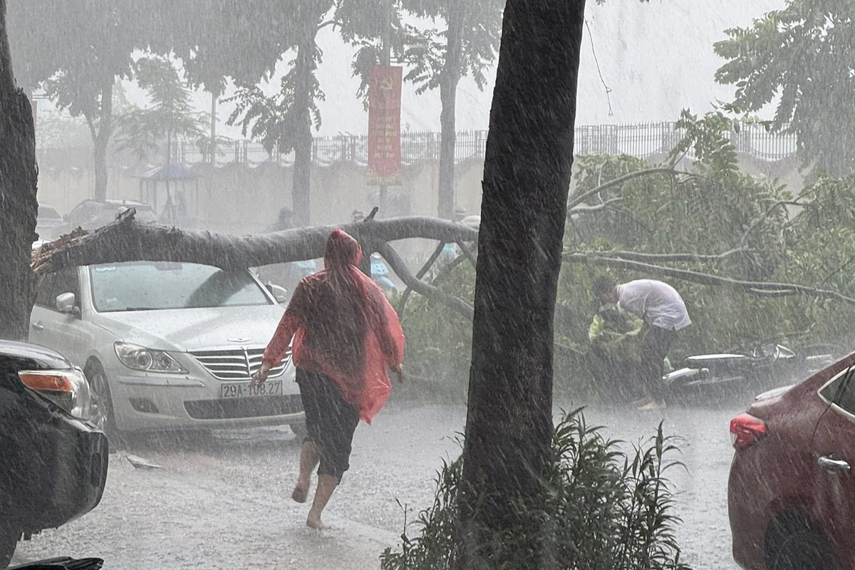 Trong mưa dông, một cây xanh trên đường Lê Trọng Tấn (phường Phương Liệt) bị gãy đổ, đè trúng ô tô đỗ ven đường và người lái xe máy.