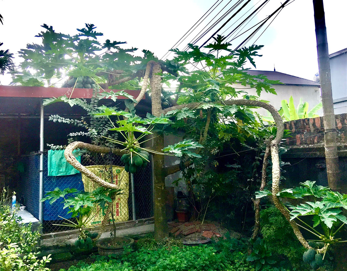 Dáng mọc kỳ lạ của một cây đu đủ được dân mạng chia sẻ dưới phần bình luận. (Ảnh: Lê Huyền Ánh)