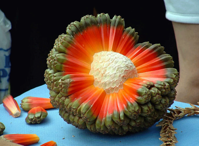 Hình ảnh quả của cây dứa dại – quả hình trứng, màu vàng cam, có cuống, bề mặt quả sần sùi.