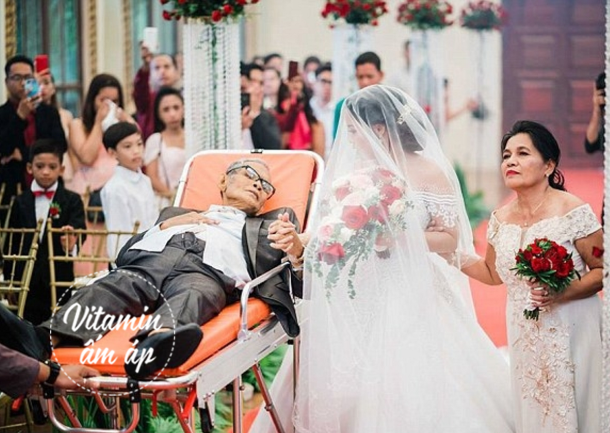 Tuy nhiên, khi sắp đến giờ tiến hành buổi lễ, sức khỏe ông quá yếu và mọi người đã phải sử dụng cáng cứu thương để ông nằm lên. Người thân và nhân viên tổ chức đám cưới đã giúp đẩy cáng về phía bục làm lễ trong khi ông cụ khó nhọc nắm lấy tay con gái mình.