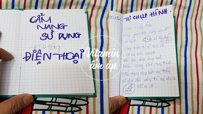Kèm theo bức thư là những hình ảnh chụp lại cuốn sổ tay nhỏ mang tên "Cẩm nang sử dụng điện thoại" mà cô làm cho mẹ. Trong cuốn sổ có ghi chép lại đầy đủ chức năng cũng như cách sử dụng những ứng dụng mà ai trong chúng ta cũng có thể sử dụng ầm ầm kể cả khi nhắm mắt nhưng lại là cả một thử thách đối với ba mẹ.