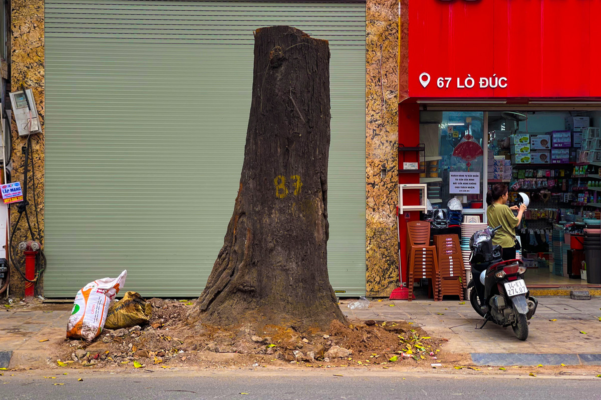 Cây sao đen trước nhà số 65 đã bị chặt hạ, chỉ còn trơ trụi gốc.