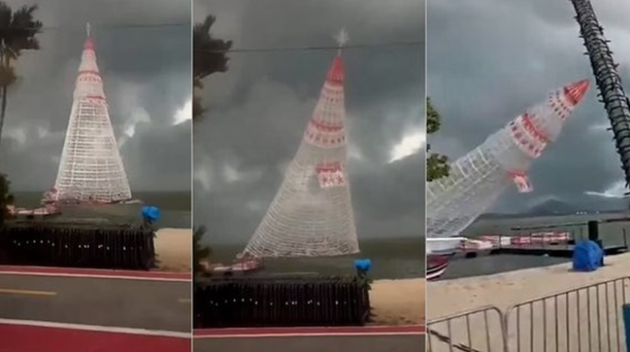 Chiều 16/12, cây thông Noel cao 58m làm từ 360.000 bóng đèn được lắp đặt trên bờ biển Lagoa de Aractiba, thành phố Maricá Rio de Janeiro, Brazil nghiêng ngả rồi đổ sập xuống biển khi cơn gió mạnh thổi qua.
