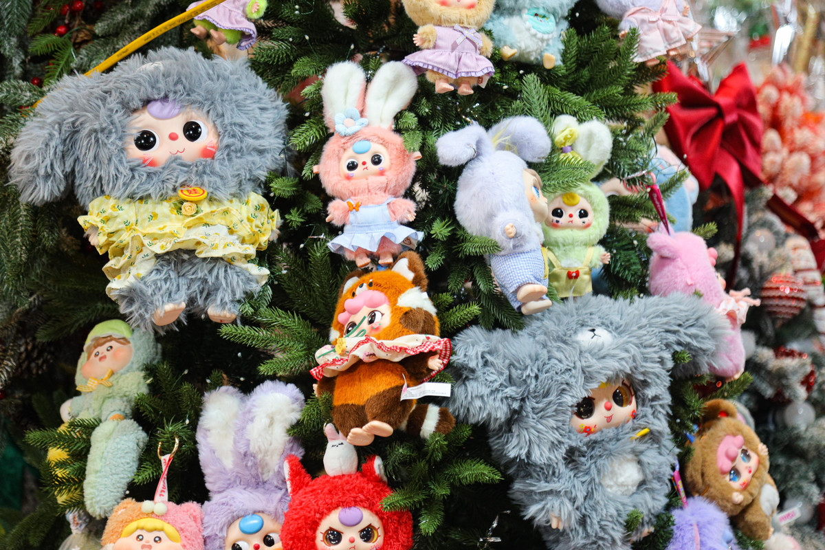 Đủ loại cây thông Noel đã được bày bán, trong đó cây thông Noel túi mù nổi bật và nhận được sự quan tâm của nhiều khách hàng vì vẻ đáng yêu của những món đồ chơi "Baby Three". Nói về ý tưởng độc lạ này, chủ cửa hàng cho biết nhằm bắt "trend" sản phẩm đang rất hút bạn trẻ trong năm nay.