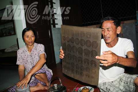 | Ông Quyết với tấm phim chụp cắt lớp của bà Mơ. Ông bảo lúc đó gần như vợ mình không còn hy vọng sống sót |