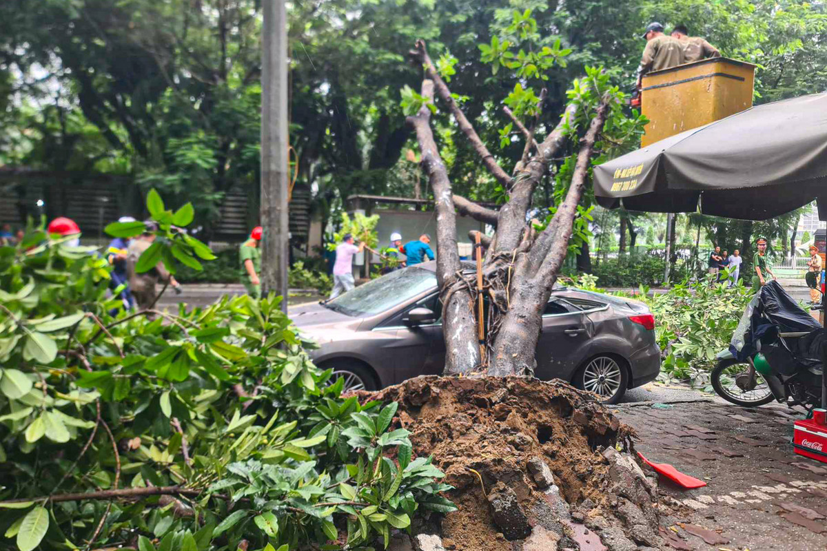 Sau khi nhận tin báo, Công an quận Thanh Xuân có mặt phân luồng giao thông, liên hệ với Công ty TNHH Một thành viên Cây xanh Hà Nội tới hiện trường để dọn dẹp, cắt bỏ cây để "giải cứu" chiếc xe ô tô con.