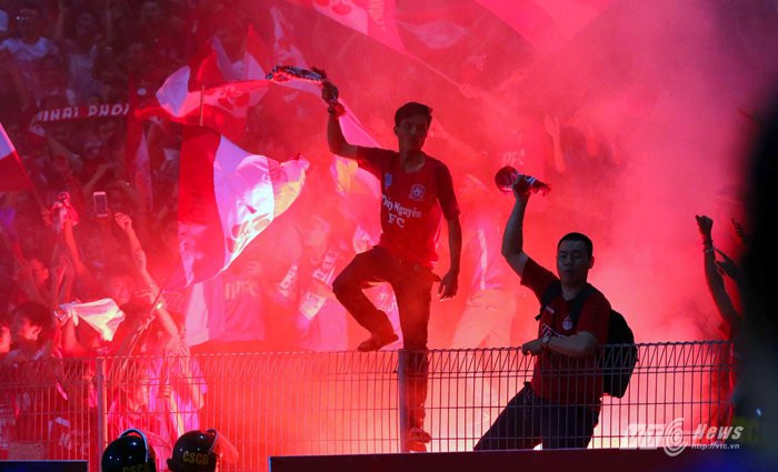 CĐV Hải Phòng đốt pháo sáng ở sân Hàng Đẫy mùa trước. (Ảnh: Quang Minh)