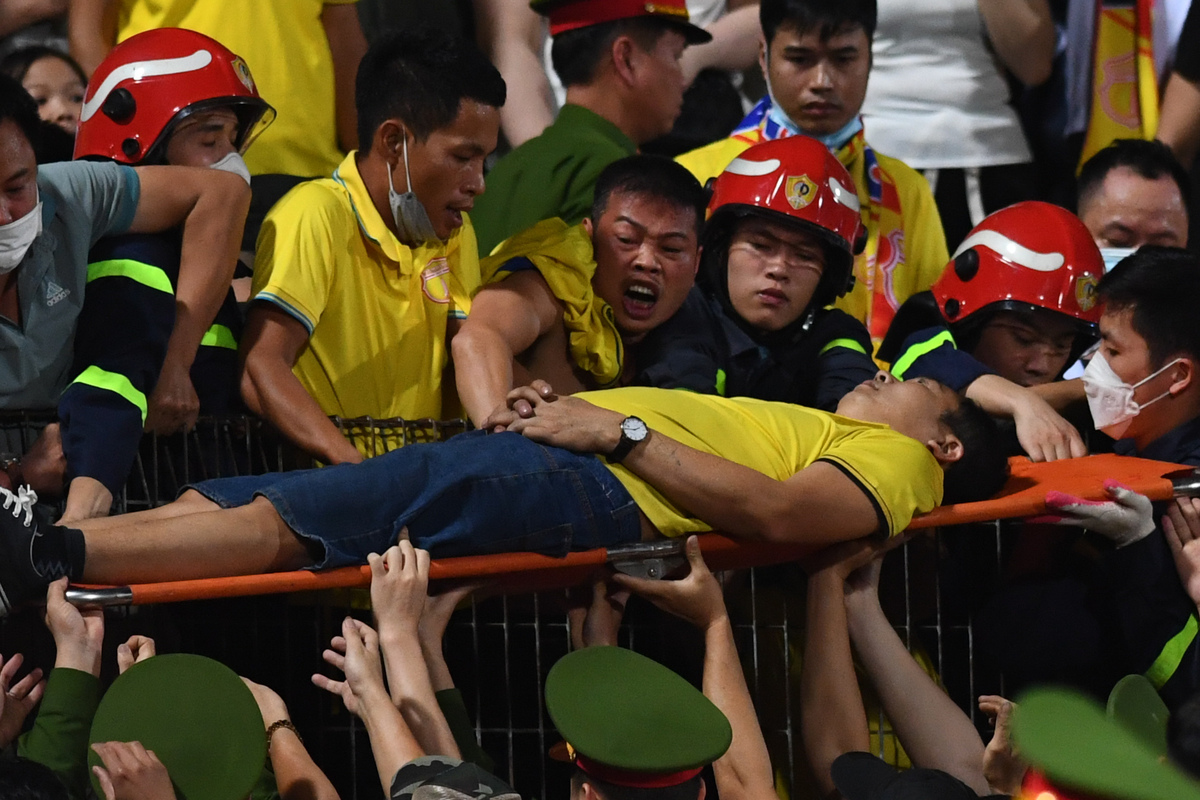 Nhân viên y tế trèo lên khán đài sơ cứu cho CĐV bị ngất.