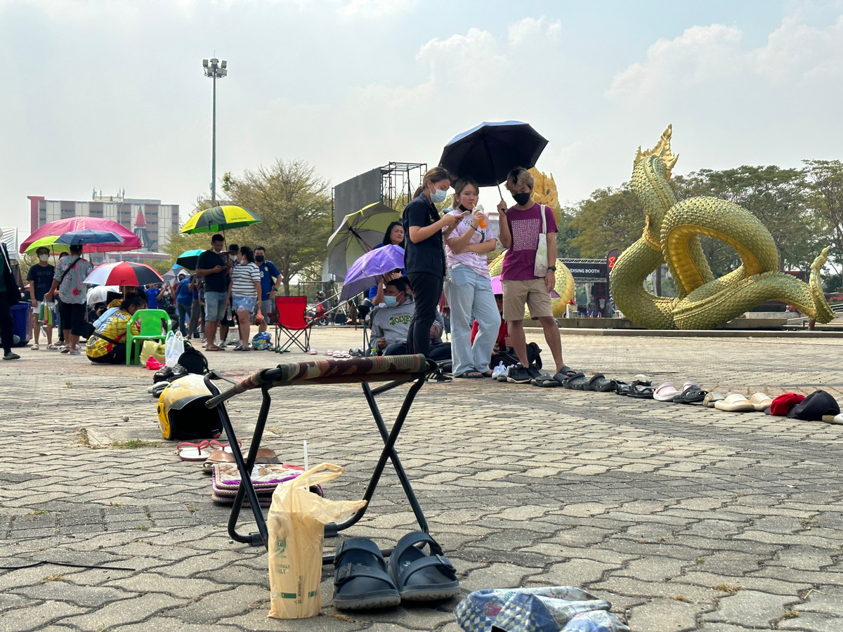 Các cổ động viên xếp hàng dài dưới trời nắng. Nhiều người đặt dép, xếp mũ và vật dụng cá nhân ở lại để giữ chỗ. Theo thông báo của ban tổ chức, phải đến 17h hôm nay các quầy phát vé mới bắt đầu mở cửa. Hiệp hội bóng đá Thái Lan (FAT) phát hành khoảng 20 nghìn vé theo hình thức trực tuyến.