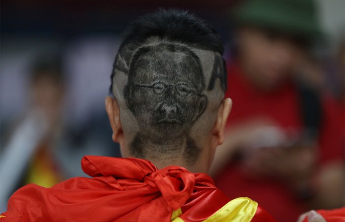 CĐV Việt Nam có mái tóc vẽ hình HLV Park Hang Seo ngay khi vừa xuất hiện trên khán đài sân Hazza Bin Zayed trong trận đấu giữa Việt Nam vs Yemen đã gây chú ý tới các phóng viên tác nghiệp tại Asian Cup 2019.