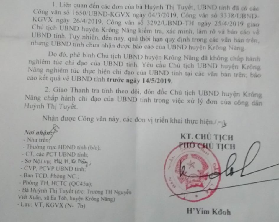 Vào ngày 29/5, UBND tỉnh Đắk Lắk ban hành công văn về việc xử lý đơn thư của bà Huỳnh Thị Tuyết và giao Chủ tịch UBND huyện Krông Năng kiểm tra, xác minh, báo cáo về UBND tỉnh.