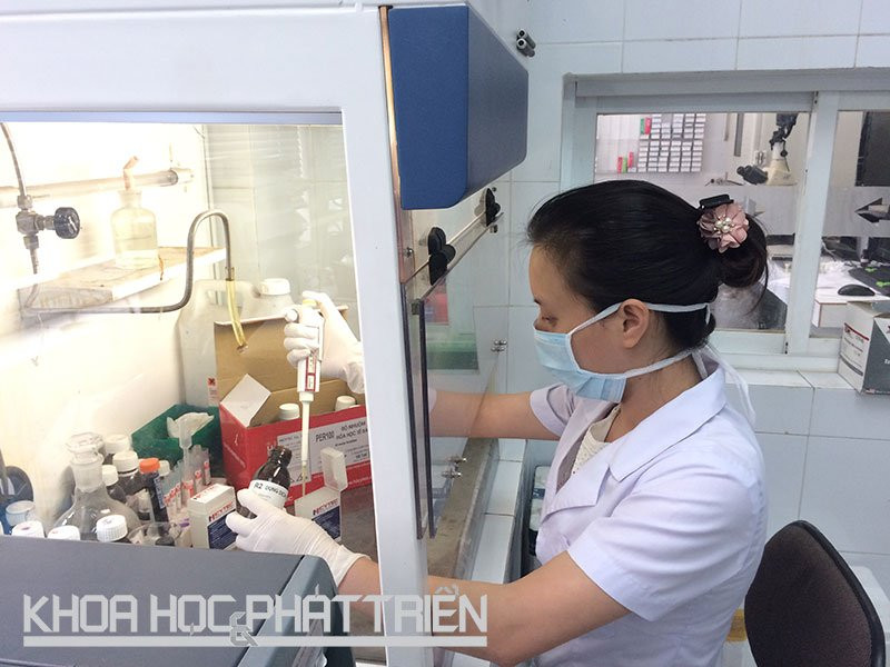 Kỹ thuật viên tiến hành tổng hợp, pha chế hóa chất sử dụng trong bộ kit nhuộm hóa học tế bào. Quy trình được thực hiện hoàn toàn trong tủ hút khí độc. Ảnh: Nguyễn Tâm