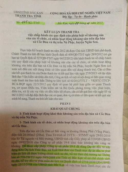 | Kết luận thanh tra của Thanh tra tỉnh Bắc Kạn liên quan đến Dự án đường Thác Bạc. |