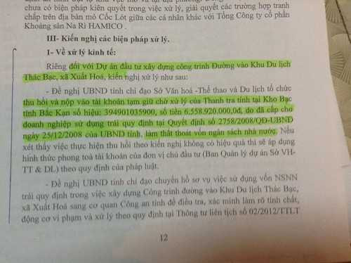 Cũng tại Văn bản này Thanh tra tỉnh Bắc Kạn đề nghị “thu hồi và nộp vào tài khoản tạm giữ chờ xử lý…số tiền 6.558,924 triệu đồng do đã cấp cho doanh nghiệp sử dụng trái quy định”.