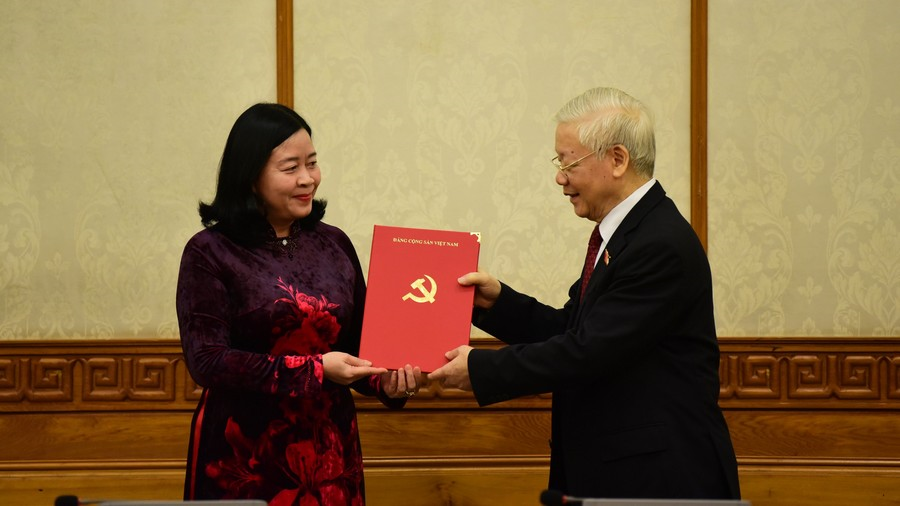 Tổng Bí thư Nguyễn Phú Trọng trao quyết định và chúc mừng bà Bùi Thị Minh Hoài, Trưởng Ban Dân vận Trung ương.