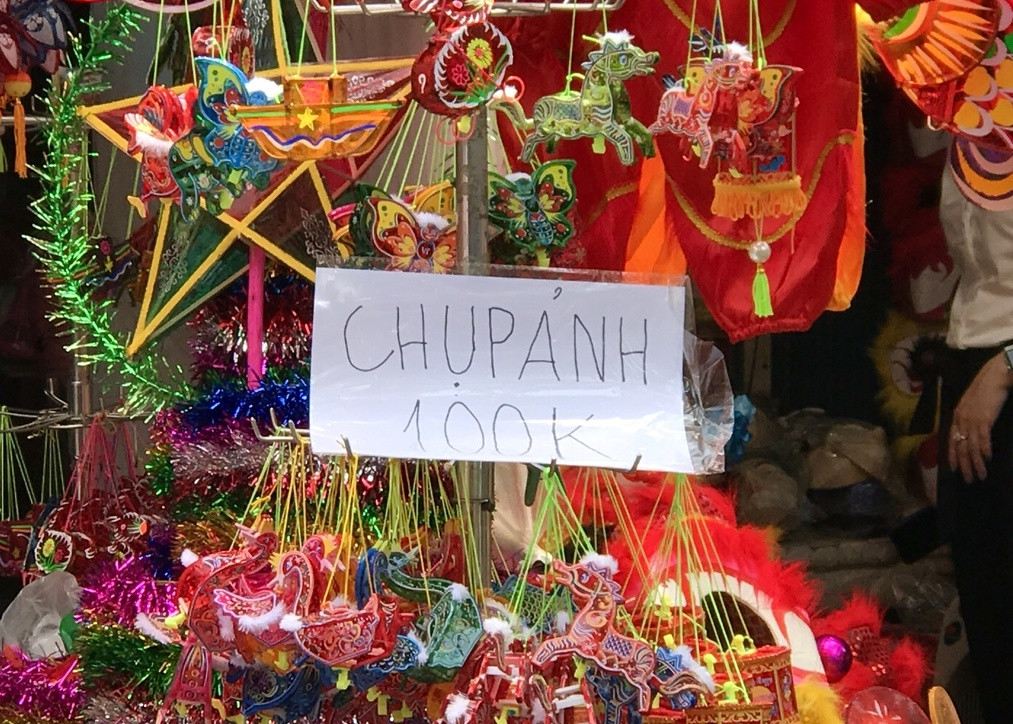 Theo ghi nhận của Zing, giữa hàng loạt món đồ trang trí Trung thu rực rỡ sắc màu dọc hai bên phố, khách tham quan có thể bắt gặp những tấm biển “Cấm chụp ảnh” hay “Ở đây thu phí chụp hình”.