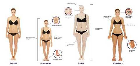 Mắt to và sáng hơn nhằm nâng cao thị lực con người ngay trong điều kiện kém ánh sáng dưới nước mà vẫn có thể mở mắt như bình thường. Cơ thể sẽ có lớp biểu bì mỡ nữa và phát triển dần lên bảo vệ cơ thể trong trường hợp lặn dưới nước lâu.