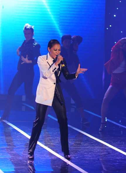 | Thu Minh vẫn nổi bật vẻ nam tính của một quý ông. Trước khi lên sân khấu biểu diễn, Nữ ca sỹ "Đường cong" diện 1 bộ vest nhưng vẫn thể hiện vẻ sexy vốn có của mình. |