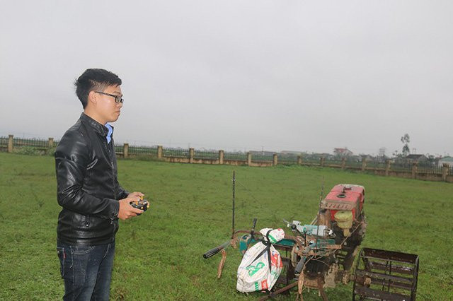 Trần Tiến Đạt đang điều khiển chiếc máy cày bằng hệ thống điều khiển từ xa. (Ảnh: Tiến Hiệp)