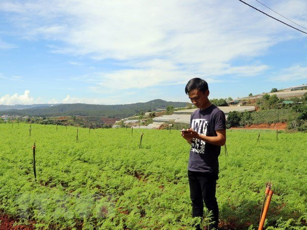 Khu vườn trồng cà rốt rộng chừng 3.000m2 của gia đình Nguyễn Quốc Huy, chúng tôi tận mắt chứng kiến cả khu vườn được tưới nước tự động thông qua một chiếc điện thoại di động được Huy điều khiển khi đang ngồi tại nhà. Hệ thống bơm nước với các van điện từ đóng mở nhịp nhàng theo một chương trình đặt trước sẽ lần lượt dẫn nước tới các bép phun nước dựng đều trên các luống rau, tưới đủ nước lần lượt cho từng khu vực.
