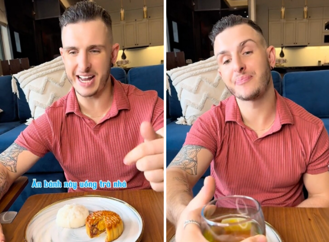 Nathan Keers thích thú thưởng thức bánh trung thu cùng trà xanh. (Ảnh chụp màn hình)