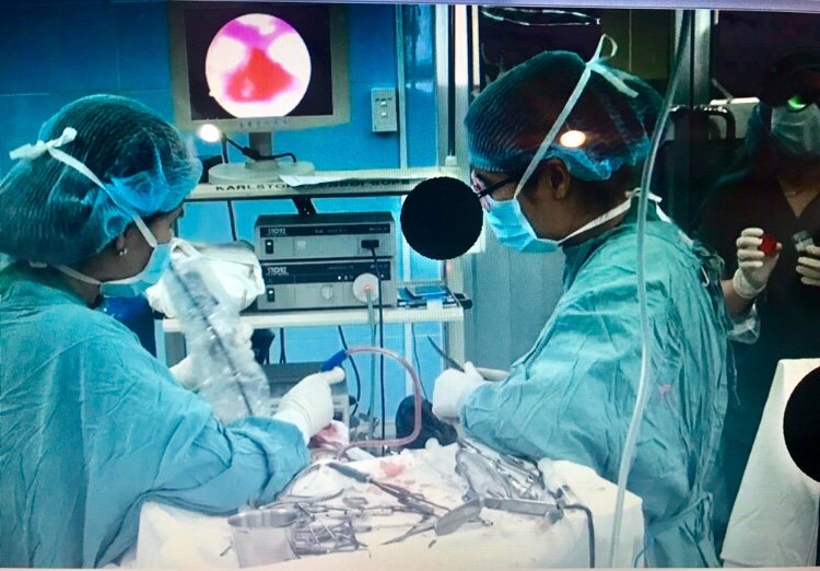 Các bác sĩ thực hiện phẫu thuật nội soi cho bệnh nhân.