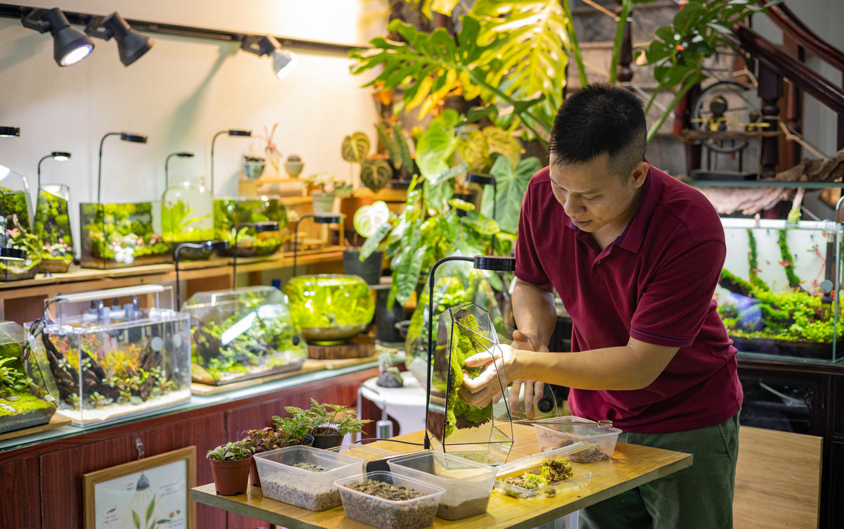 Sau 5 năm tìm hiểu và mày mò làm những "lồng kính xanh", anh Tiến Mạnh (31 tuổi, ở Hà Nội) quyết định nghỉ hẳn việc văn phòng, chuyển sang thiết kế những vườn sinh thái thu nhỏ để bán. "Đây là đam mê xuất phát từ tình yêu thiên nhiên. Sau khi nhận thấy không gian xanh xung quanh mình đang dần ít đi, tôi quyết định nghiên cứu và tự tạo ra những hệ sinh thái nhỏ trong lồng kính của riêng mình", anh Mạnh chia sẻ.
