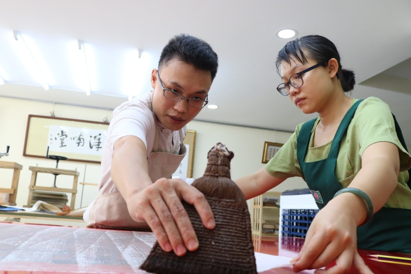Anh Phúc cùng vợ Trần Bội Tuyền đang dán keo để bồi giấy dó bảo quản cho tư liệu. Đây là công đoạn đòi hỏi sự tỉ mỉ trong từng đường quét keo.