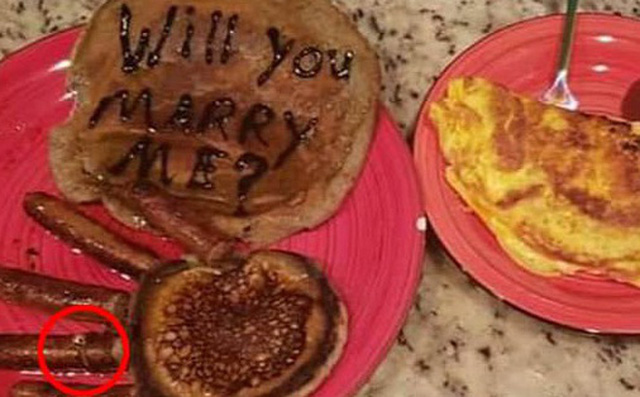 Theo đó, chàng trai ra tay làm bữa ăn sáng nhân ngày sinh nhật của cô, ghi chữ "Lấy anh nhé?" lên miếng bánh. Phần đặc sắc nhất là một mẩu bánh khác cùng 5 cây xúc xích xếp thành hình bàn tay. Zoom kĩ hơn, chúng ta liền thấy một món trang sức bé xinh ở ngón đeo nhẫn.