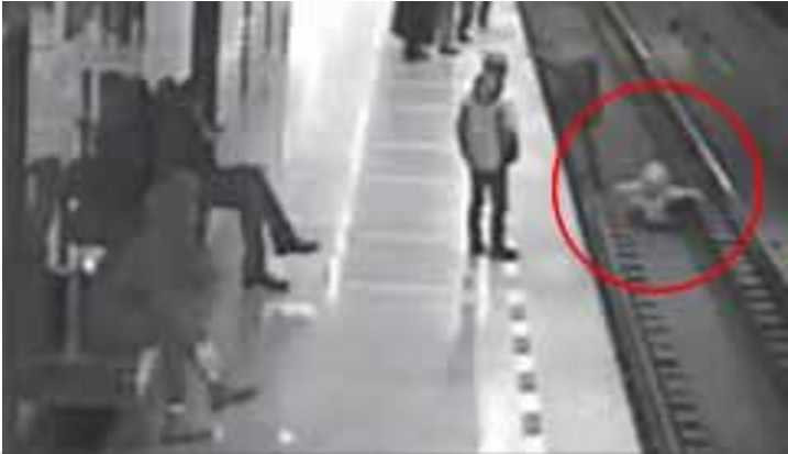 Một số người đứng xung quanh thấy nhưng chần chừ, không dám xuống cứu vì tàu hỏa đang lao tới. Khi đó, xuất hiện chàng trai dũng cảm, nhảy xuống ôm bé lên trước khi tàu chạy qua.