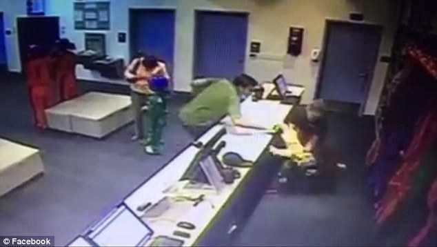 Trong chớp mắt, cậu bé 3 tuổi mất thăng bằng và rơi tự do từ trên bàn đăng ký xuống dưới đất. Rất may, Jesse 'Tex' Leos, nhân viên của trung tâm nhảy dù đứng ngay cạnh đó đã kịp vươn tay đỡ lấy cậu bé.