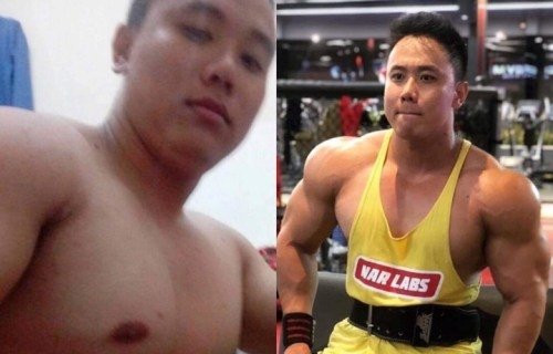 Quốc Anh trước và sau tập gym.