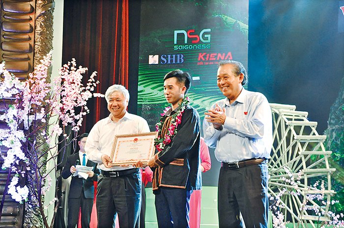 Nguyễn Văn Huỳnh nhận hoa và Bằng khen do Phó thủ Tướng thường trực Trương Hòa Bình và Bộ trưởng, Chủ nhiệm UBDT Đỗ Văn Chiến trao tặng. (Ảnh: Hoàng Mai)