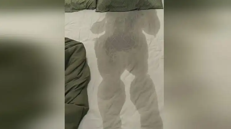 Mồ hôi của chàng trai bị sốt ướt đẫm trên giường, in thành hình dáng toàn bộ cơ thể.