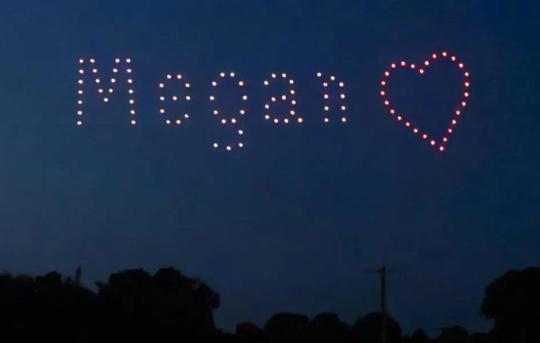 Loạt máy bay không người lái tạo thành một số hình ảnh về chủ đề tình yêu trên bầu trời như hình trái tim... trên nền nhạc bài hát yêu thích của cặp đôi. Một lúc sau, những chiếc máy bay không người lái xếp thành dòng chữ "Cưới anh nhé" và "Megan".
